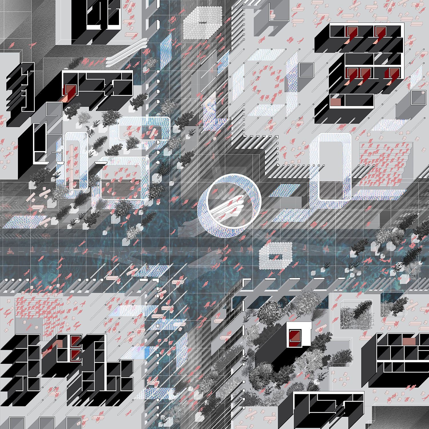 The extruded volume of the grid lines is comprised of glass floors that become a new medium between skyscrapers. These filled voids not only free people from the ground, which is endangered by the rising sea level, but also provide a possibility, by directly confronting the existing walls, to dissolve the distinct boundaries that were set to divide space as private property. It emancipates the network of production from the repeated typical plan and to overcome the schism that the grids initiated between the exterior and the interior, the public domain and the private property, as well as the poor and the wealthy.